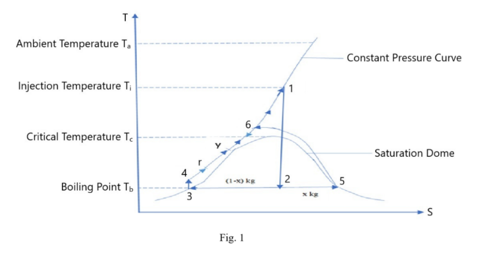 Fig.1. Schematic of T-S diagram of SHAPE/APG power cycle for closed cycle operation with a fixed amount of working fluid (cryogen). [A7]. P1 = Pressure at states 4, r, y, 6 and 1 in Fig.1 and also in Fig.2. The temperatures of states 4, r, y, 6 and 1 are T4, Tr, Ty, T6 and T1 respectively. The pressure corresponding to states 2, 3, 5 are P2 [P2 can be 1 bar or less].