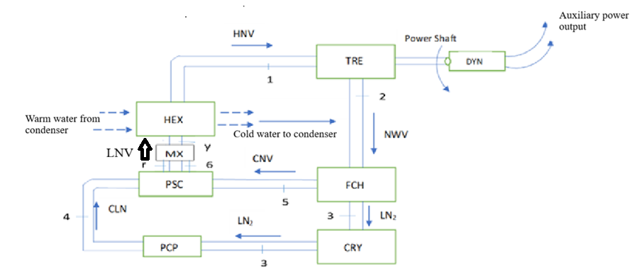 Referred to Figs.1-4 the abbreviations are: CLN – Compressed Liquid Nitrogen; CNV – Cold Nitrogen Vapor; CRY – Highly Insulated Cryostat with liquid nitrogen (LN2); DYN – Dynamo to convert rotational energy of the shaft to electrical power; FCH – Flash Chamber (Insulated); LNV – A Single Fluid Stream of high pressure from mixer MX; HNV – LNV with energy from warm water; LN2 – Liquid Nitrogen; NWV – Cold Nitrogen Wet Vapor; MX – Mixer. N2 = Nitrogen. PCP – Pump (High Pressure); PWO – Power Output (Electrical); PSC – Polytropic Screw Compressor; TRE – Turbo – Expander; Twwater = Temperature of warm water. SHAPE- Single hybrid ambient power engine.